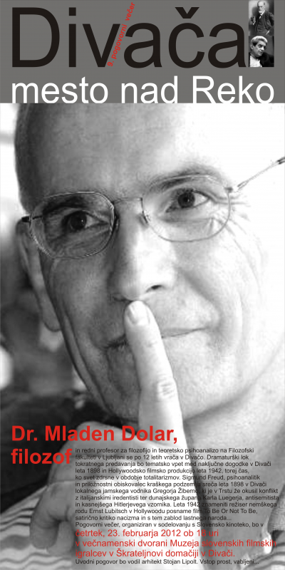 Dr. Mladen Dolar, redni profesor za filozofijo in teoretsko psihoanalizo na Filozofski fakulteti v Ljubljani, eden najbolj zaželjenih in uglednih slovenskih predavateljev na tujih univerzah, se po 12 letih vrača v Divačo. Leta 2000 sta s kolegom dr. Slavojem Žižkom predavala v Divaški jami na temo Smeri razvoja interpretacije sanj. Dramaturški lok tokratnega predavanja bo tematsko vpet med naključne dogodke v Divači leta 1898 in Hollywoodsko filmsko produkcijo leta 1942, torej čas, ko svet zdrsne v obdobje totalitarizmov. Sigmund Freud, utemeljitelj psihoanalize in priložnostni obiskovalec kraškega podzemlja sreča leta 1898 v Divači lokalnega jamskega vodnika, posebneža Gregorja Žiberno, ki v Trstu že okusi konflikt z italijanskimi iredentisti ter dunajskega župana Karla Luegerja, zapriseženega antisemitista in kasnejšega Hitlerjevega vzornika. Obe srečanji opiše v svoji korespondenci prijatelju Wilhelmu Fliessu. Leta 1942 znameniti režiser nemškega rodu Ernst Lubitsch, mojster subtilnih in prefinjenih komedij, v Hollywoodu posname film To Be Or Not To Be, zgodbo o poljskem teatru v času nemške okupacije, ki v njemu lastni filmski poetiki predstavlja satirično kritiko nacizma in s tem zablod lastnega naroda...