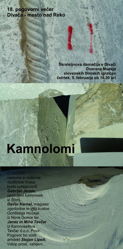 Kras je prepreden z mrežo več sto ponekod že komaj razpoznavnih opuščenih kamnolomov. Okamenele priče dela kamnarjev predstavljajo presečišče naravne in kulturne dediščine Krasa ter nenadomestljiv vir njegove identitete. O heterogeni geološki sestavi kraških tal, ležiščih naravnega kamna na območju med Divačo, Lokvijo, Povirjem, Repentabrom, Koprivo in Nabrežino, zakladnici orodij in znanj kamnarjev ter njihovi predanosti poklicu, razvojnih možnostih kamnolomov ter prizadevanjih za vzpostavitev muzeja kamnoseštva na Krasu bodo spregovorili gostje večera: