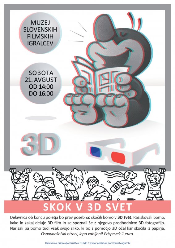 Delavnica ob koncu poletja bo prav posebna: skočili bomo v 3D svet. Raziskovali bomo, kako in zakaj deluje 3D film in se spoznali še z njegovo predhodnico: 3D fotografijo. Narisali pa bomo tudi vsak svojo sliko, ki bo s pomočjo 3D očal kar skočila iz papirja.