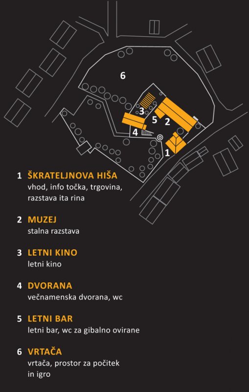 V pritličju Škrateljnove hiše, kjer v nadstropju domuje stalna razstava posvečena Iti Rini, je osrednji informacijski prostor celotnega kompleksa in delovni prostori. V nekdanji štali je na ogled osrednja stalna razstava posvečena slovenskim filmskim igralcem. Hram s skednjem je preurejen v večnamensko dvorano. Osrednji muzejski prostor in večnamensko dvorano povezuje letni kino, borjaču z letnim barom pa je namenjena vloga družabnega prostora celotnega kompleksa.